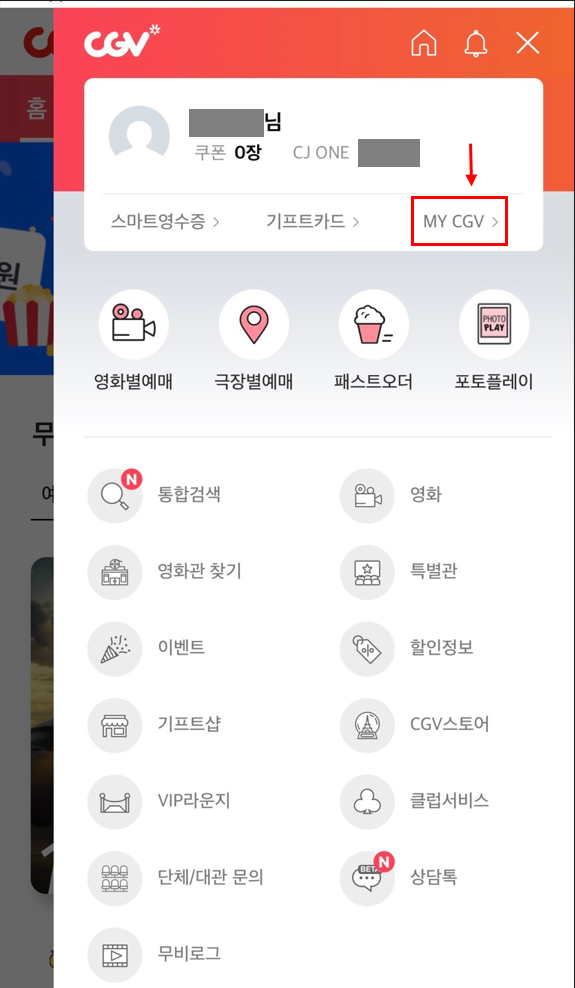 'MY CGV'를 눌러줍니다.