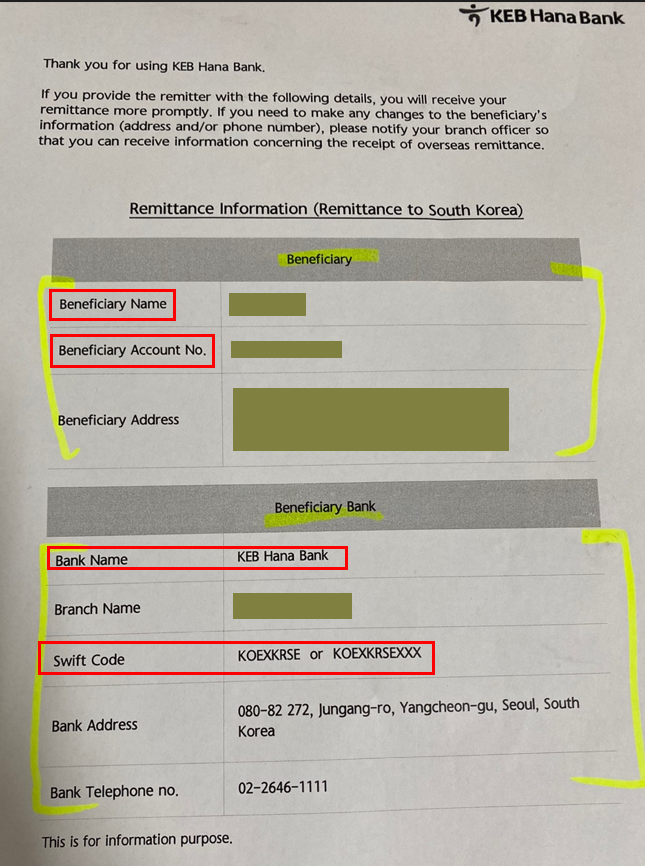 당시 아래와 같이 Remittance information 서류도 받아왔답니다.