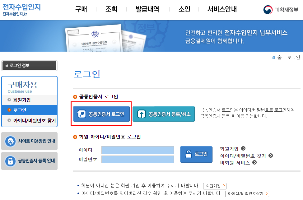저희의 경우 '공동인증서 로그인'을 하였습니다.