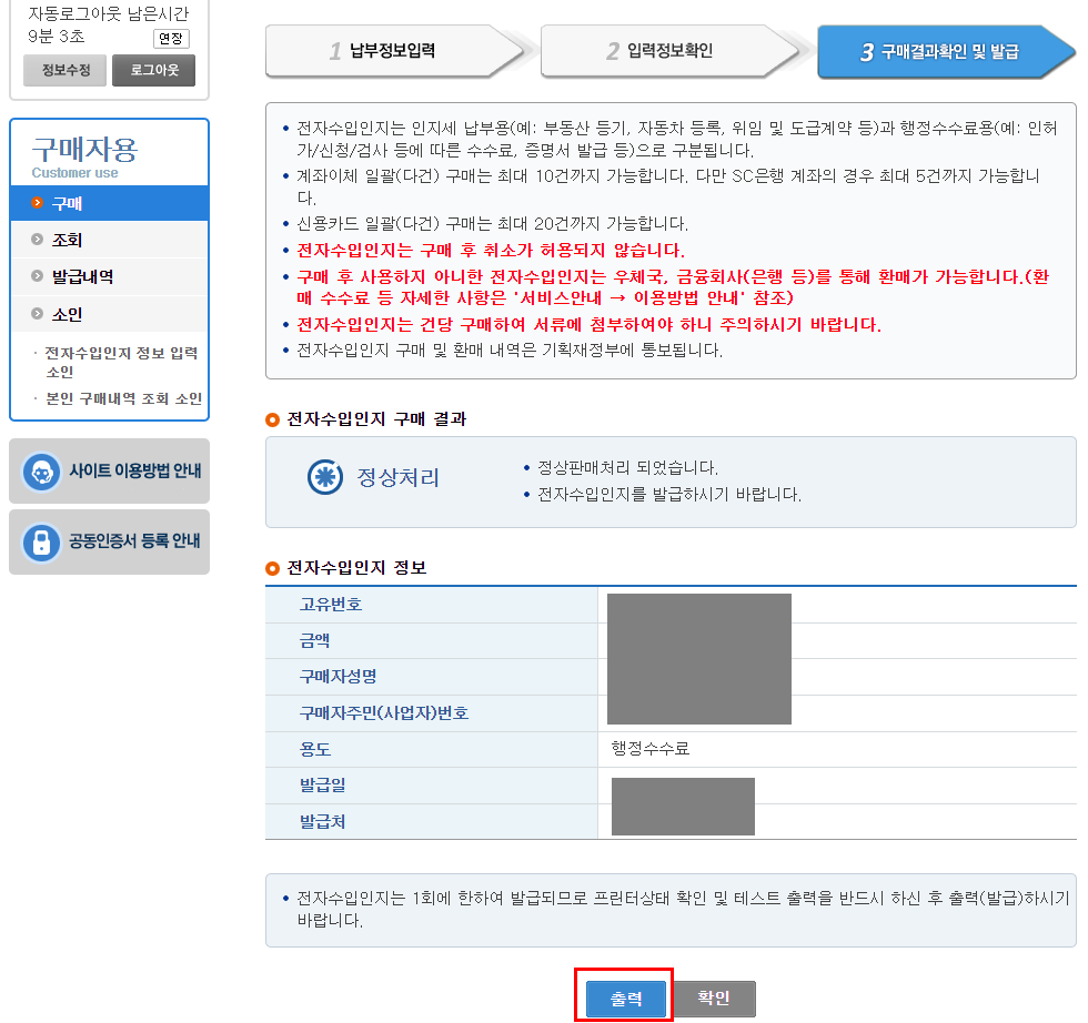 정상처리 화면 및 전자수입인지 정보를 확인 후