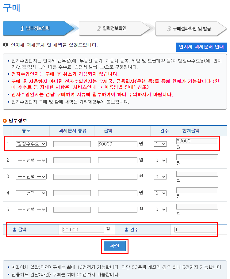 중간 우측에 '전자수입인지 납부(구매) 방법 안내'가 있으니 참고해 주세요~
