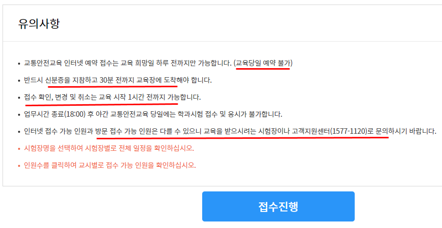 '응시 전 교통안전교육' 예약을 위해 웹사이트에서 실명 인증을 하는데 외국인이라 그런지 실명인증이 되지 않았어요. 고객센터로 문의 시 외국인의 경우 당일 직접 내방해서 자리가 있으면 들을 수 있다는 안내를 받았어요.