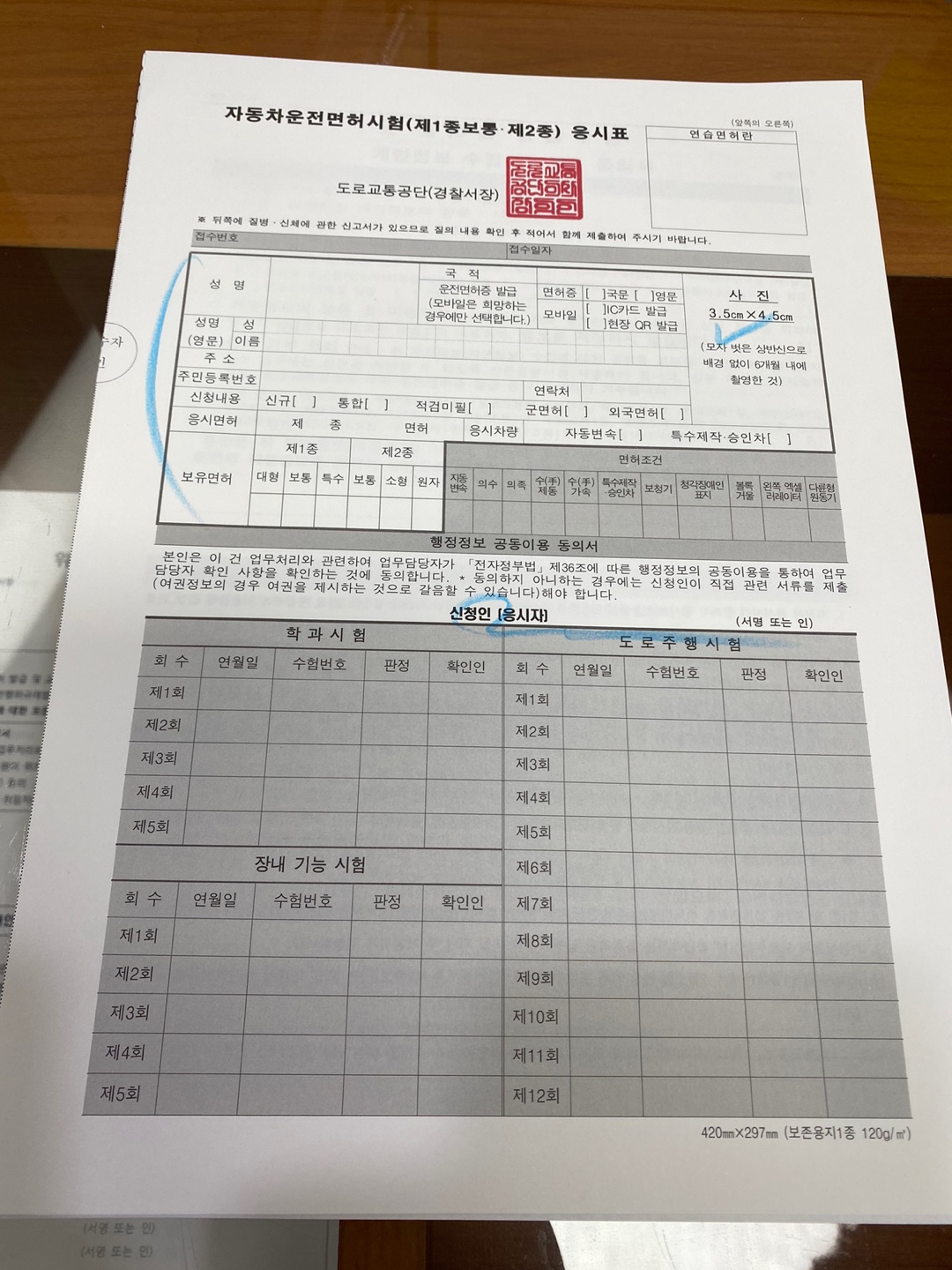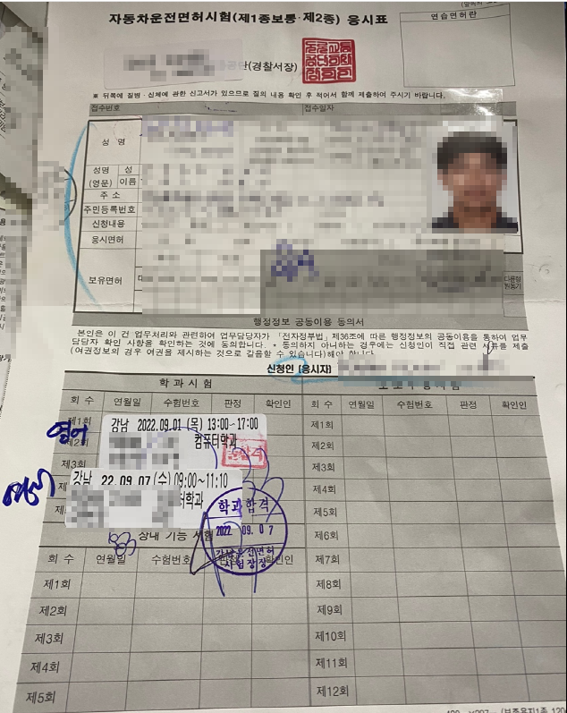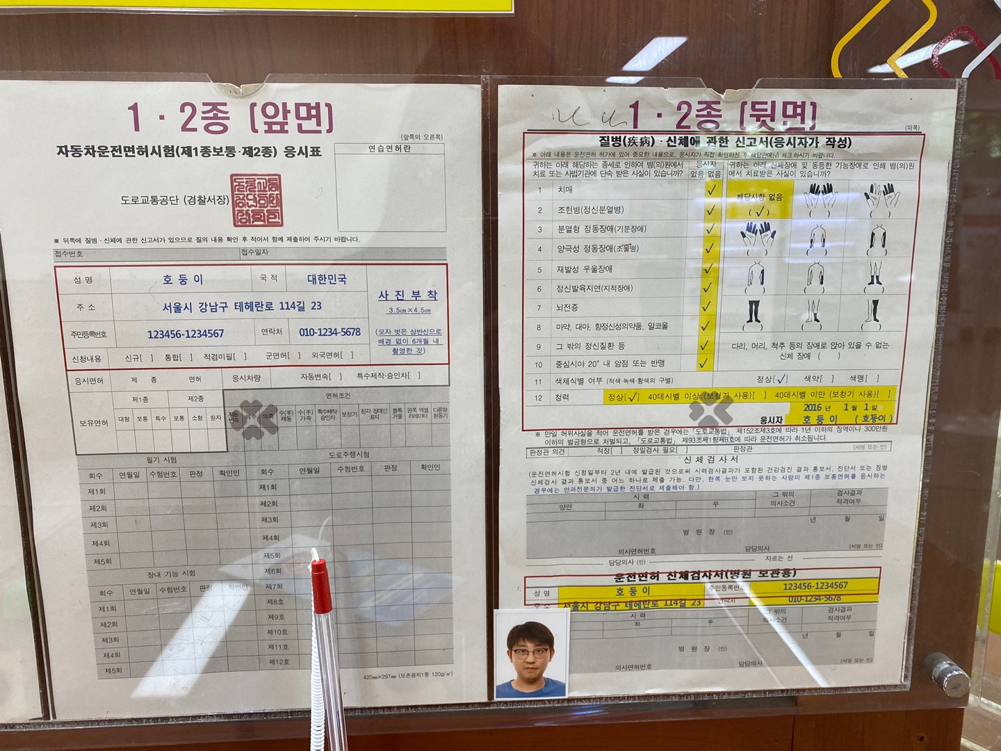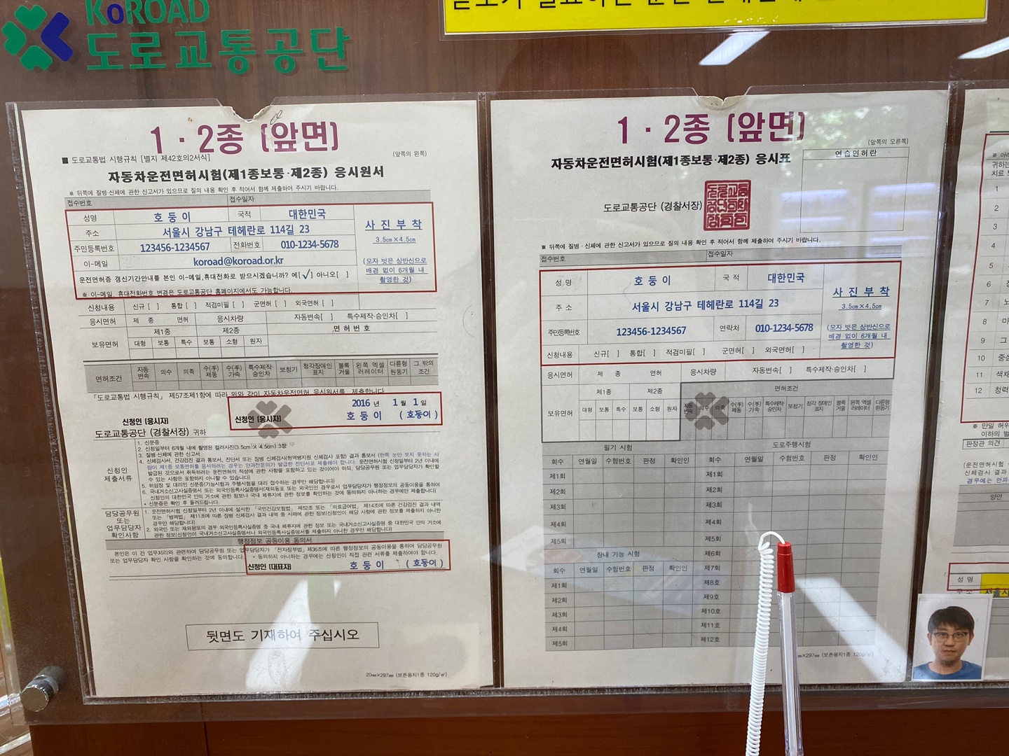 교육을 다 듣고 나면 '자동차 운전면허시험(제1종보통, 제2종) 응시표'를 받아서 나옵니다. 비치된 작성 샘플을 참고하여 색연필로 표시된 곳을 작성해 주고 사진(3.5 cmX4.5 cm) 2장을 붙여줍니다. 혹시 사진이 없다면 면허시험장 내부에도 2층에 사진실이 있고 시험장 외부에도 사진관이 있습니다.