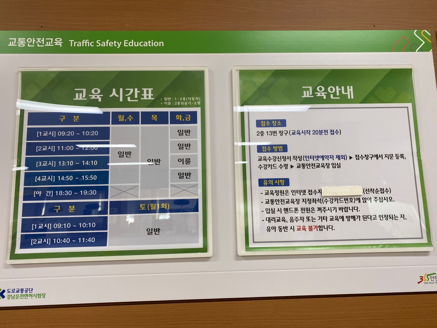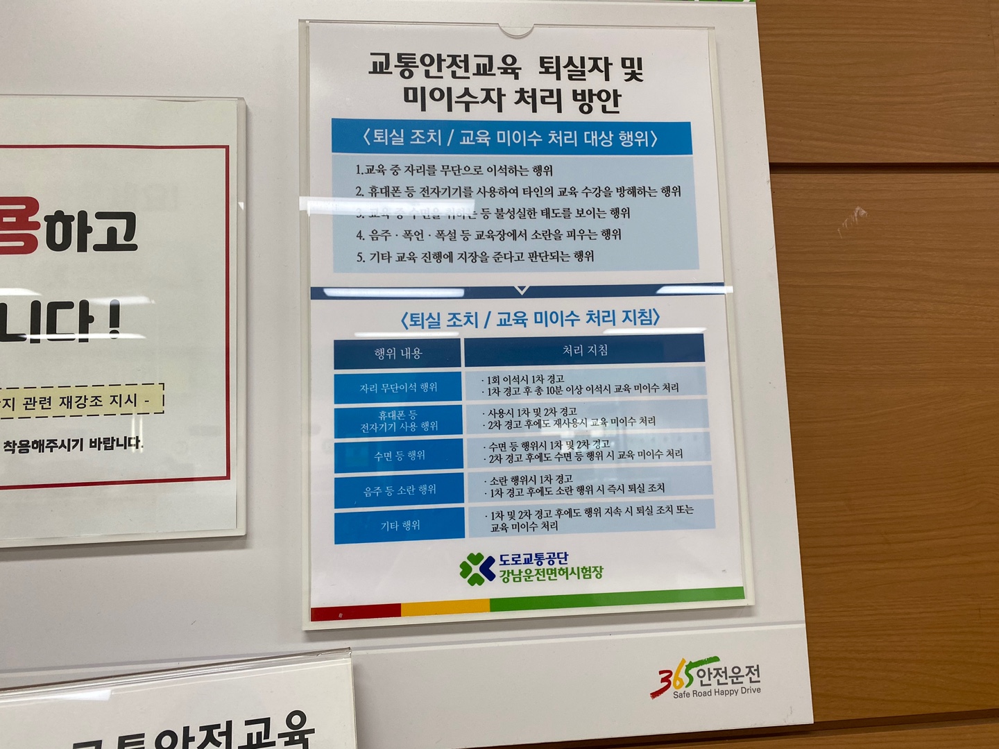 저희는 강남운전면허시험장으로 갔고 9: 20분 교육을 듣고 싶었는데, 조금 늦어서 11시 교육을 듣게 되었어요.