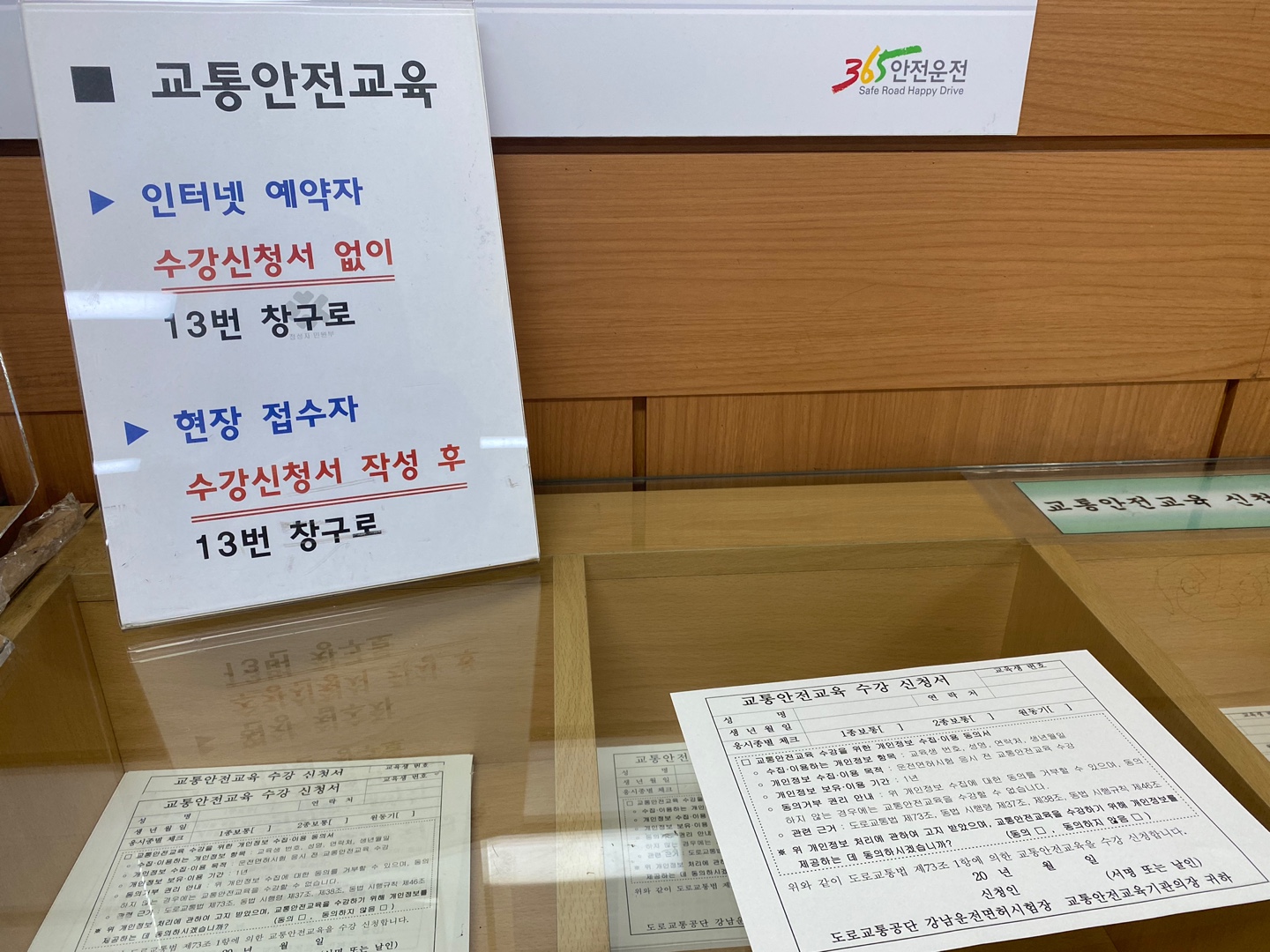 비치된 '교통안전 교육 수강신청서'를 작성 후 10시 40분에 접수하면 됩니다. 남편은 현장 접수자여서 신청서와 외국인등록증을 가지고 13번 창구로 가서 접수했습니다. 외국인은 외국인등록증을 꼭 가지고 와야 합니다.