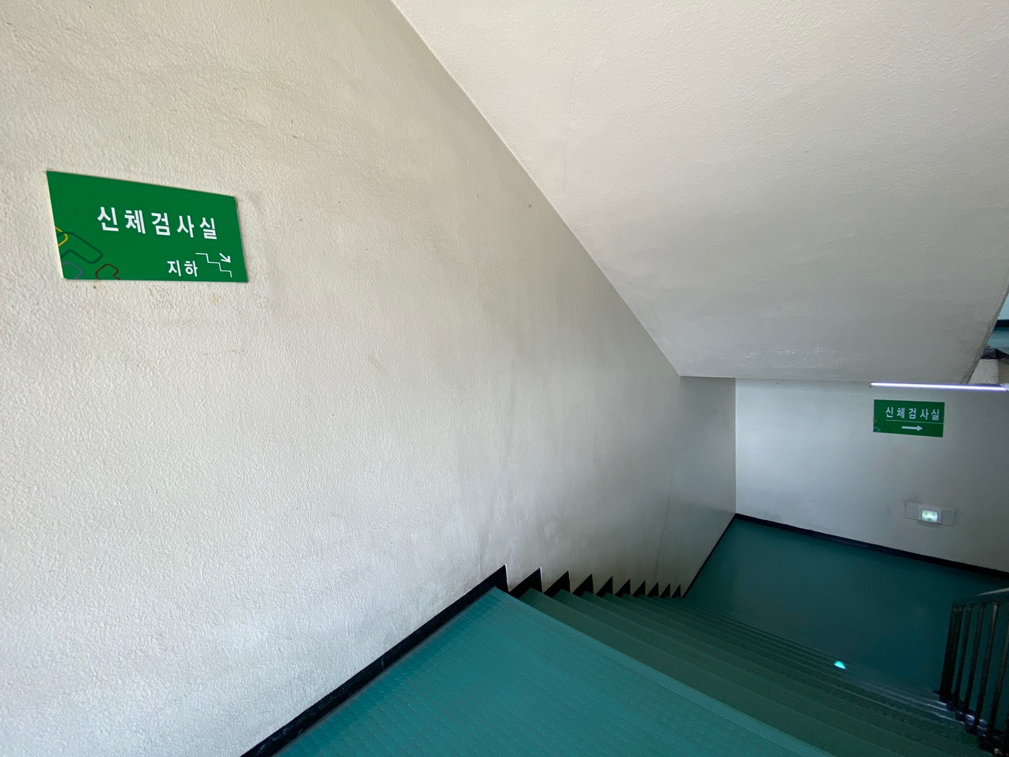 응시표는 1층 안내데스크에서도 받을 수 있습니다. 응시표 작성 완료 후 접수를 하려 했더니, 신체검사실에서 시력 검사를 하고 와야 한다고 했습니다. 2년 내에 건강검진을 받았다고 했더니 조회를 해보고 시력이 기준 미달이라 다시 하고 와야 한다고 안내를 받았습니다.