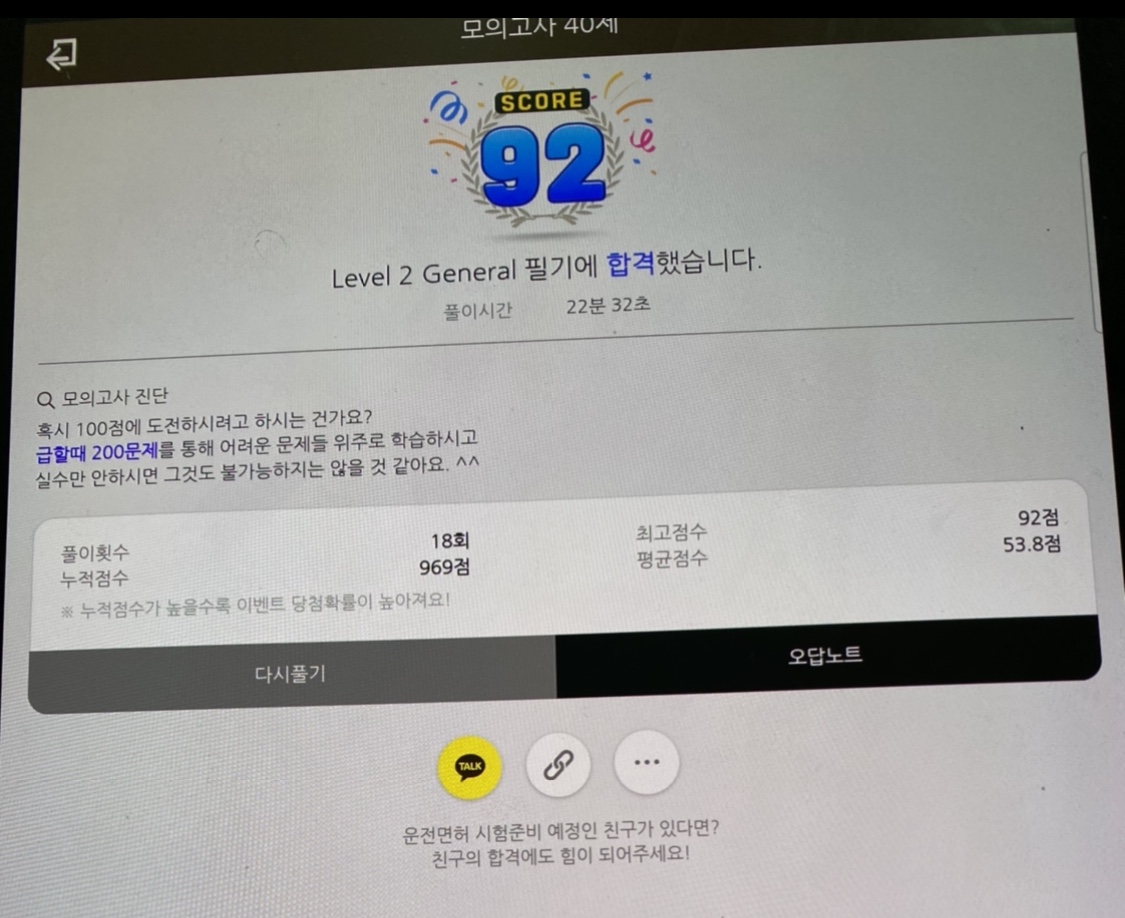첫 번째 시험 떨어지고 와서 계속 공부하더니 모의고사에서 92점까지 맞더라고요 ㅎㅎ