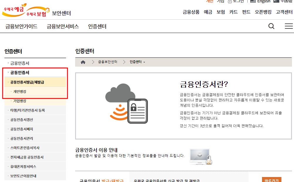 2. '공동인증서발급/재발급' 및 밑에 '개인뱅킹' 클릭합니다.