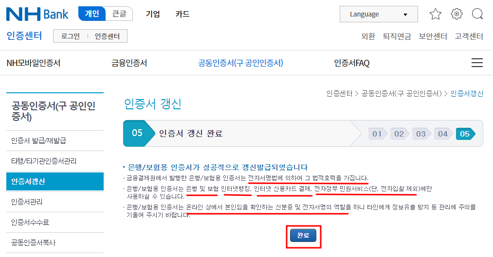 아래와 같이 '은행/보험용 인증서가 성공적으로 갱신발급되었습니다'라고 뜨면 끝입니다.
