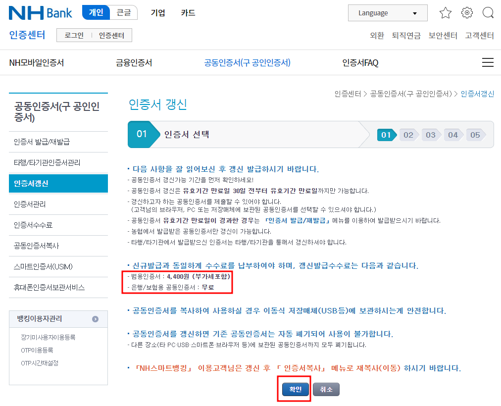 왼쪽에 '인증서 갱신'을 누른 후 내용을 확인하고 하단의 '확인'을 클릭합니다.