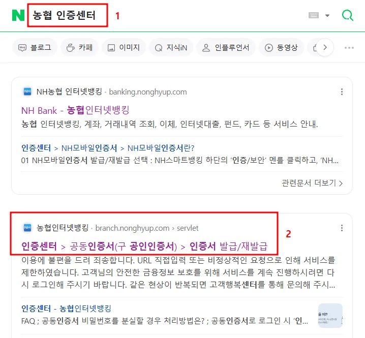 먼저 '농협 인증센터'를 검색하고 '인증센터' 웹사이트를 클릭해 줍니다.
