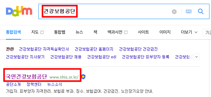 1. 다음 등 검색 포털에서 '건강보험공단' 을 검색하고 웹사이트에 접속합니다.
