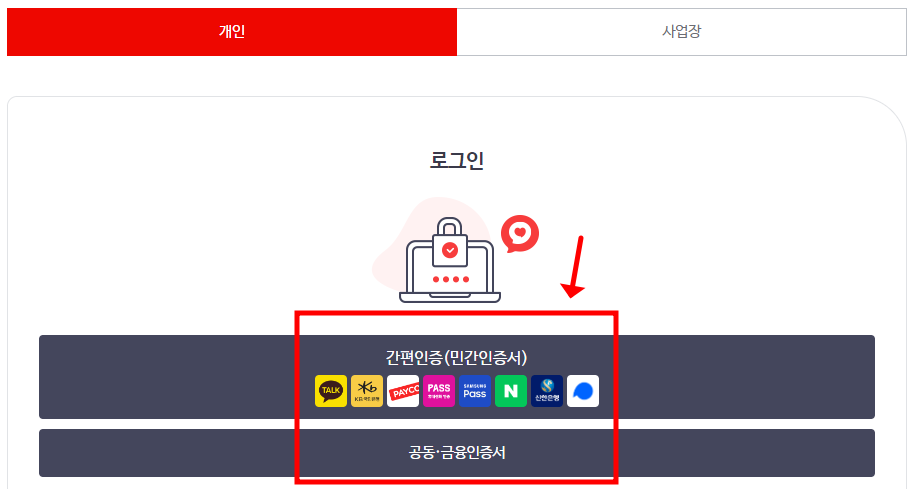 2. 간편인증(민간인증서) 또는 공동/금융인증서로 로그인합니다.