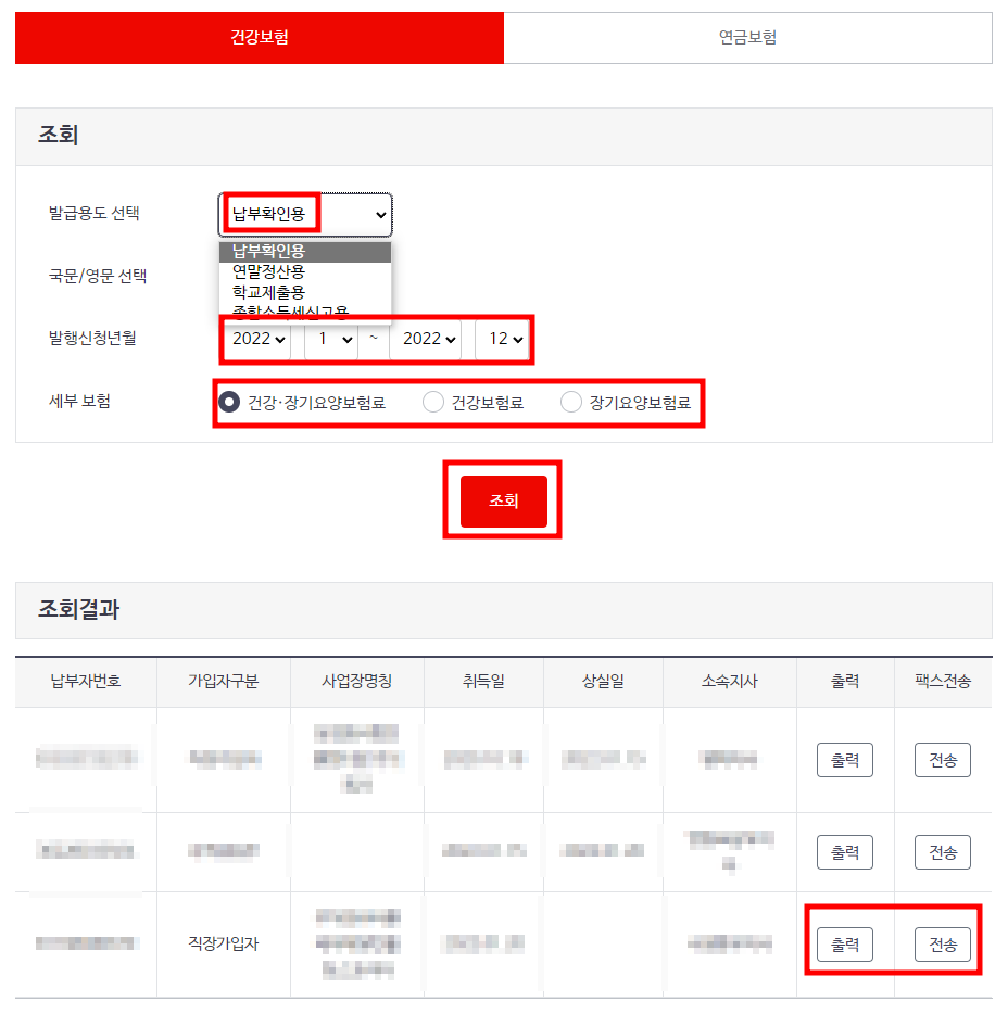 5. '발급용도 선택'에서 해당 용도를 선택(납부확인용/ 연말정산용/학교제출용/ 종합소득세신고용)하고 '발행신청년월일'을 설정해줍니다. '세부보험'을 선택하고 하단에 '조회'를 클릭합니다. '조회결과'에서 해당되는 사업장의 '출력' 또는 '전송(팩스로 받고자하는 경우)'을 클릭해줍니다.