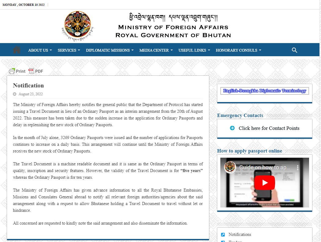| The Ministry of Foreign Affiars hereby notifies the general public that the Department of Protocol has started issuing a Travel Document in lieu of an Ordinary Passport as an interim arrangement from the 20th of August 2022. 외교부는 2022년 8월 20일부터 임시약정으로 일반여권 대신 여행증명서 발급을 시작했음을 통보합니다. This measure has been taken due to the sudden increase in the application for Ordinary Passports and delay in replenishing the new stock of Ordinary Passports. 이번 초치는 일반여권 신청이 급증하고 일반여권의 재고 보충이 늦어지면서 취해진 것입니다. In the month of Jyly alone, 3,269 Ordinary Passports were issued and the number of applications for Passports continues to increase on a daily basis. 7월 한달 동안만 3,269개의 일반 여권이 발급되었고 여권 신청 건수는 매일 계속 증가하고 있습니다. This arrangement will continue until the Ministry of Foreign Affairs receives the new stock of Ordinary Passports. 이 조치는 외교부가 새로운 일반 여권 재고를 받을 때까지 계속 될 것입니다. The Travel Document is a machine readable document and it is same as the Ordinary Passport in term of quality, inscription and security features. 여행 증명서는 기계로 읽을 수 있는 문서이며, 품질, 적힌 글 과 보안 기능 면에서 일반 여권과 동일합니다. However, the validity of the Travel Document is for "five years" whereas the Odinary Passport is for ten years. 그러나 여행증명서의 유효기간은 "5년"이며 일반여권은 10년입니다. The Ministry of Forign Affiars has given advance information to all the Royal Bhutanese Embassies, Missions and Consulates General abroad to notify all relevant forign athorities/agencies about the said arrangement along without let or hindrance. 외교부는 모든 해외 주재 부탄 대사관과 공관 및 영사관에게 여행 서류를 소지한 부탄인들이 아무런 방해도 받지 않고 여행할수 있도록 요청과 함께 관련 외국 당국/기관에 통보할 사전 정보를 제공했습니다. All concerned are requested to kindly note the said arrangement and also disseminate the information. 모든 관련자들은 해당 조치에 대해 숙지하고 정보를 공유해주시기 바랍니다. |