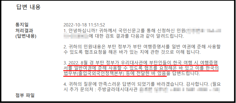 드디어 남편은 다음주에 입국 예정입니다. 입국 시 문제가 없을지, 인천공항출입국외국인청, 외교부, 법무부로 문의를 했었는데 답변은 아래와 같이 받았답니다.