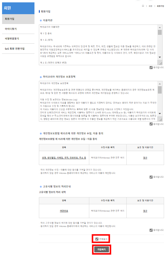 이용약관, 개인정보 보호정책, 개인정보 수집/이용 동의, 고유식별정보의 처리 안내 내용을 읽고 하단에 '전체 동의'에 체크하고 '가입하기'를 클릭합니다.