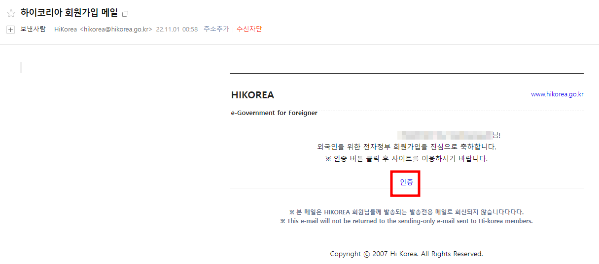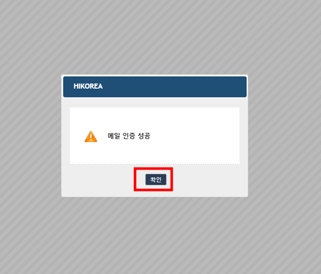 5~6분이 지나고쯤 하이코리아 회원가입 인증 메일이 왔어요. 하단에 '인증'을 클릭해 줍니다. '메일인증성공'이라는 메시지창이 뜨면 하단에 '확인'을 클릭해 줍니다.