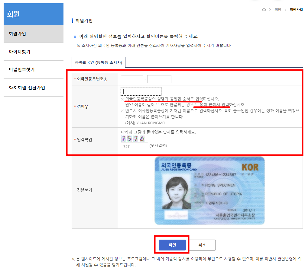 외국인등록번호, 성명, 입력확인에 보이는 네 자리 숫자를 입력하고 하단에 '확인'을 클릭합니다.