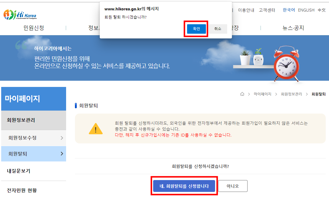 하단에 '네, 회원탈퇴를 신청합니다'를 클릭하면 상단에 회원 탈퇴 하시겠습니까?라는 메시지가 뜨는데 '확인'을 눌러주면 됩니다.