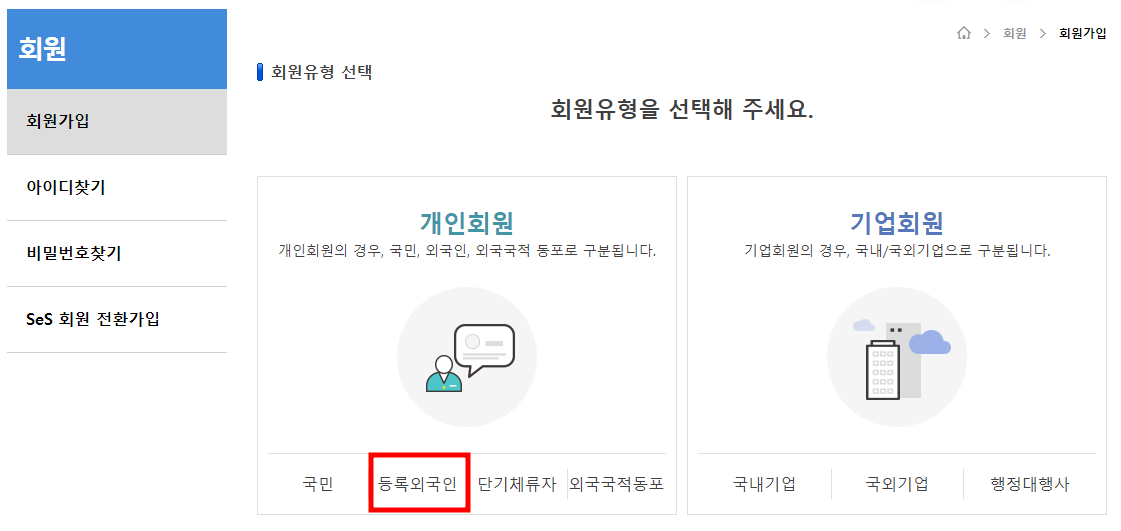 '개인회원'에서 '등록외국인'을 클릭합니다.