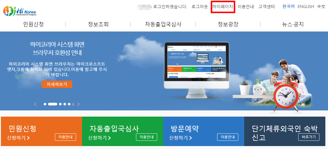 우측 상단에 '마이페이지'를 클릭해 줍니다.