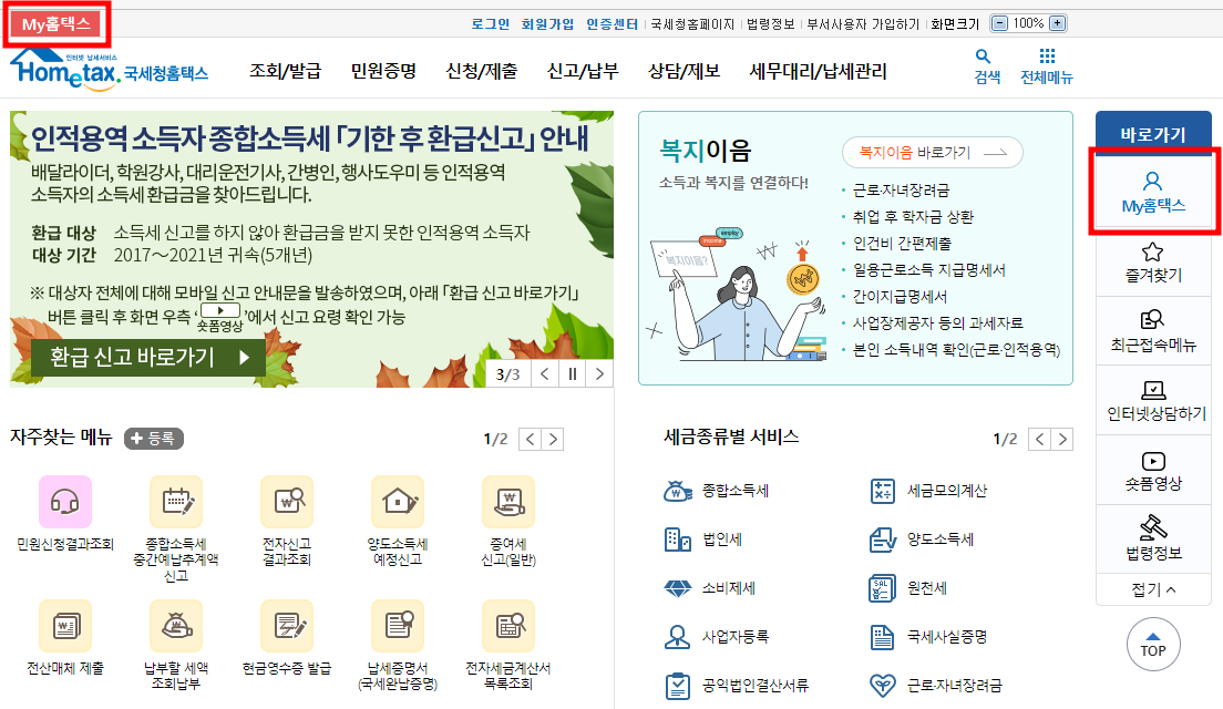 1. 네이버, 다음, 구글 등 사이트에서 홈택스를 검색하여 접속 후 화면 우측의 'My 홈택스' 클릭해 줍니다.