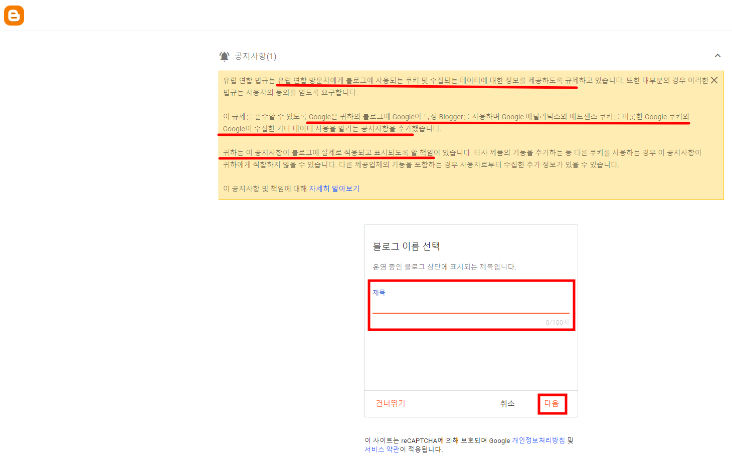 운영할 블로그의 이름(제목)을 적은 후 '다음' 버튼을 클릭합니다.