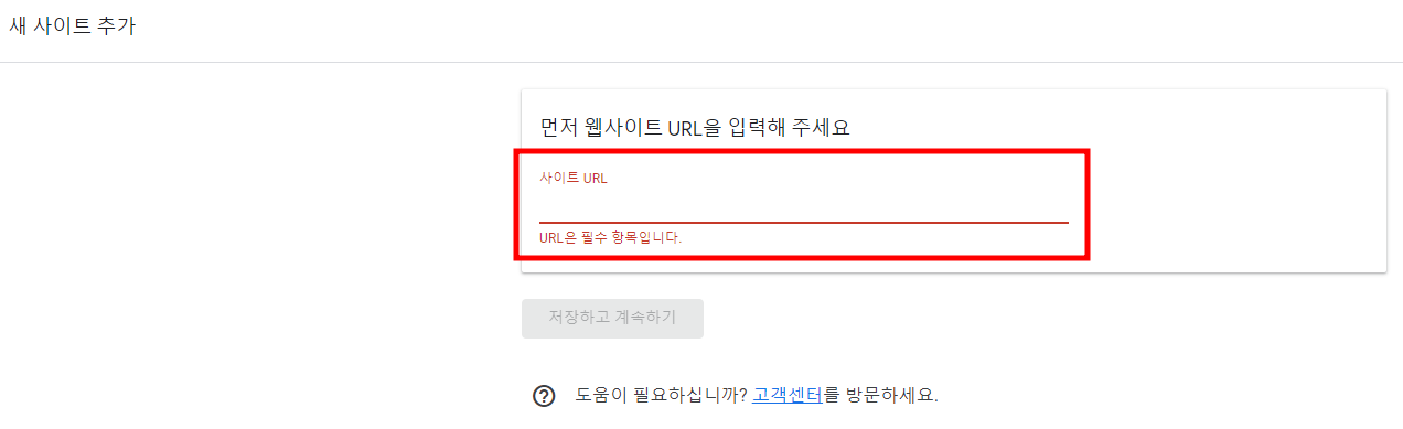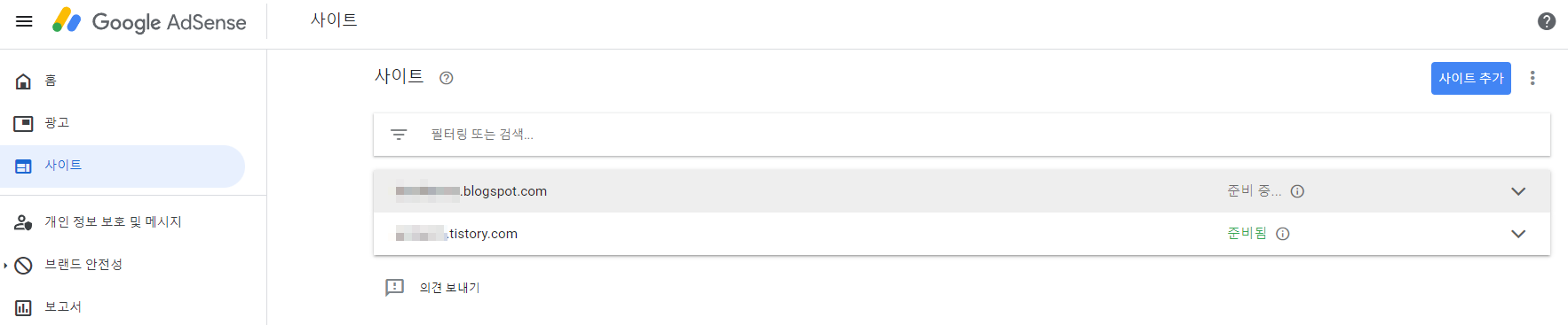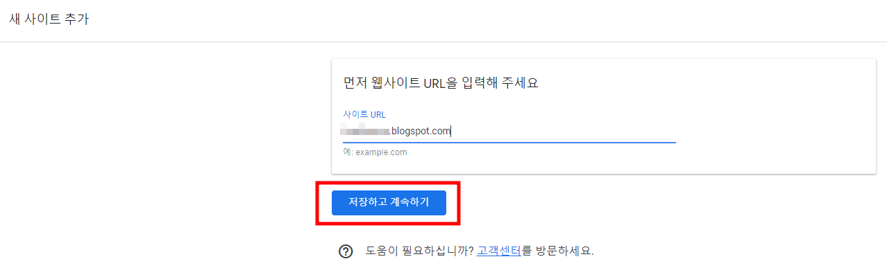 구글애드센스에서 '사이트' 탭 및 '사이트 추가'를 클릭하고 blogger(구글블로그) URL을 입력한 후 '저장하고 계속하기' 버튼을 클릭합니다.