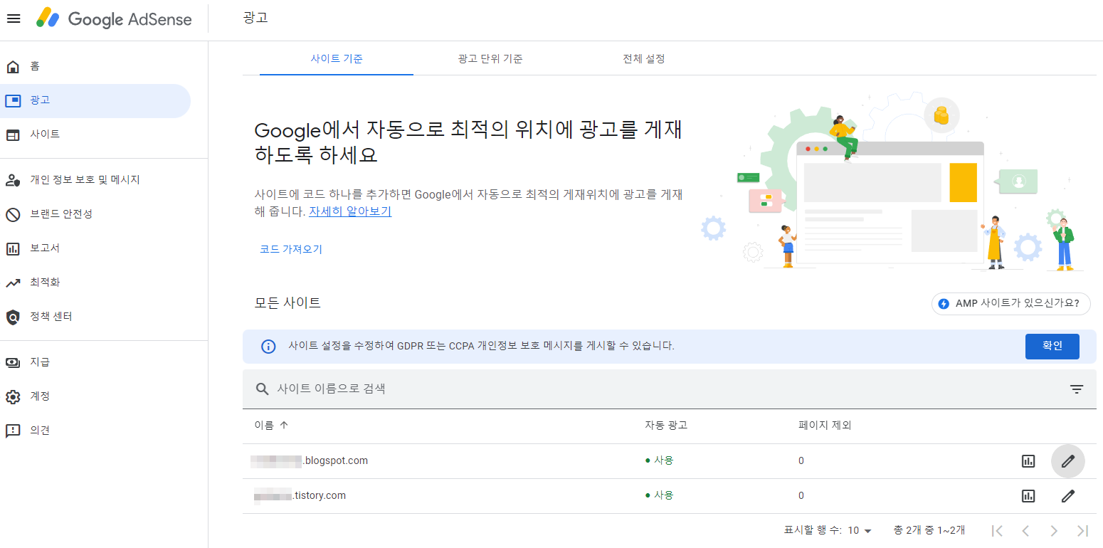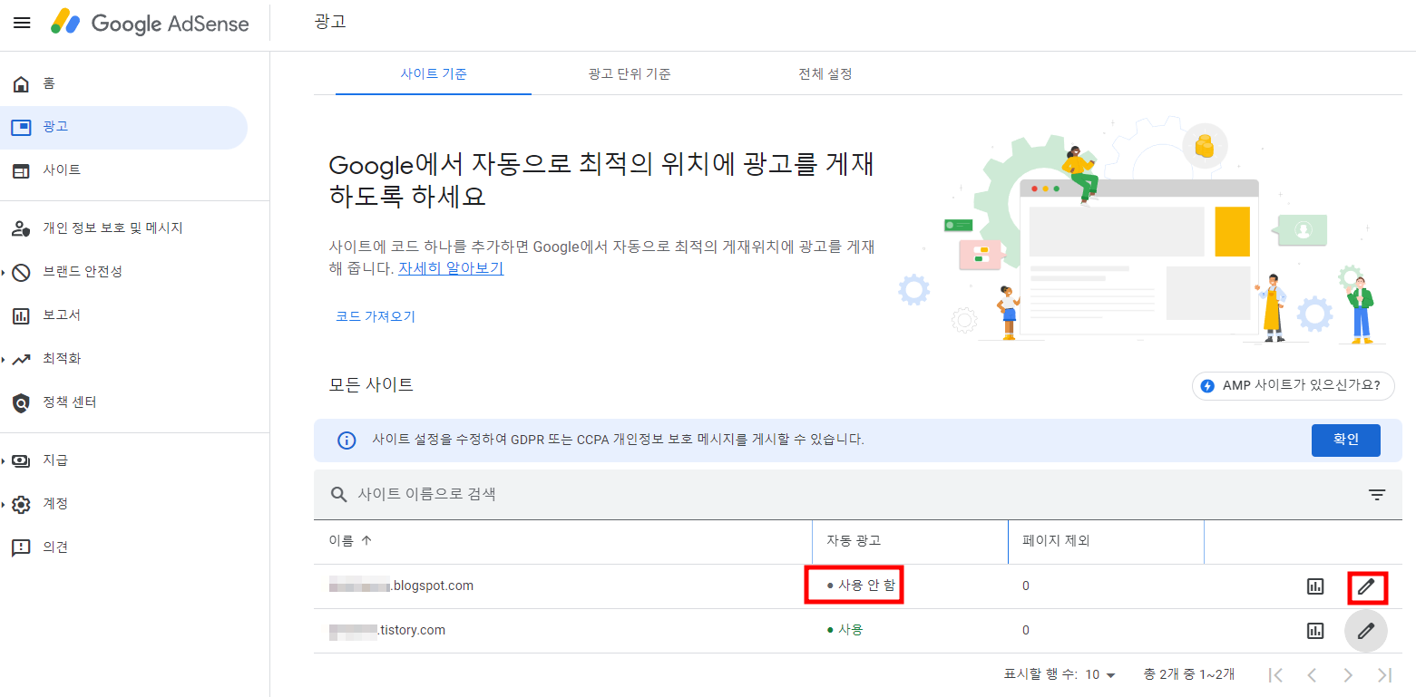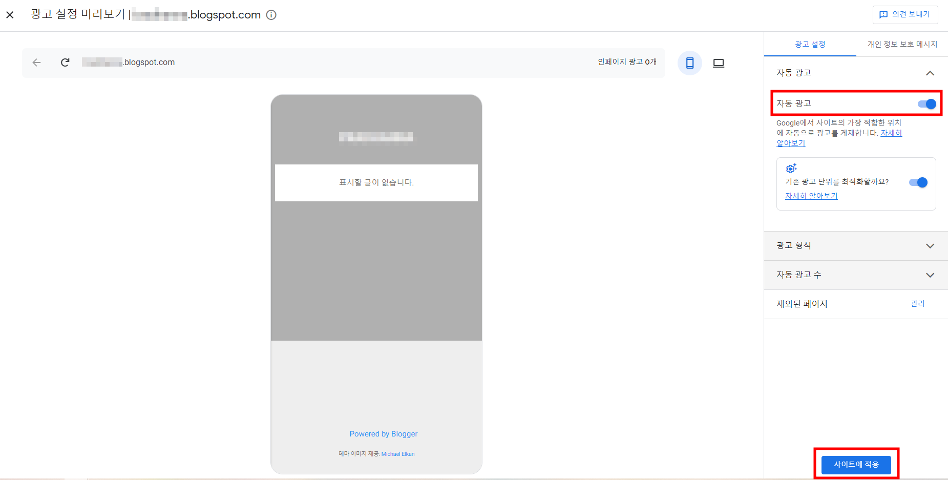 자동광고가 나오도록 설정 후 변경사항이 사이트에 반영되기까지 최대 1시간이 걸릴 수 있다고 하니 참고해 주시기 바랍니다.