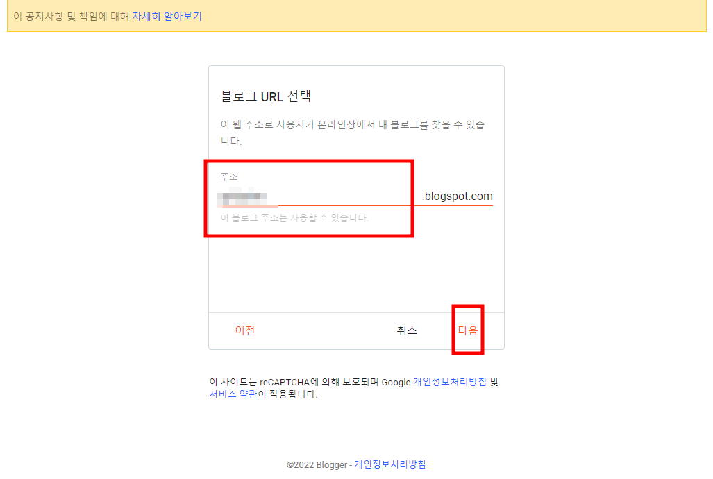 원하는 블로그 주소를 입력하고 다음을 눌러줍니다.