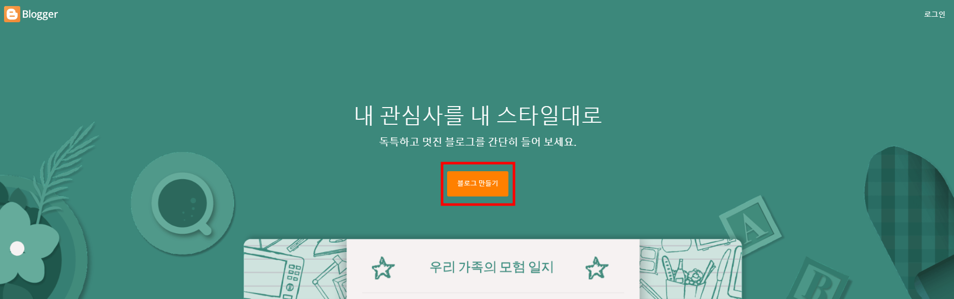 구글 블로그 메인화면에서 '블로그 만들기' 버튼을 클릭합니다.