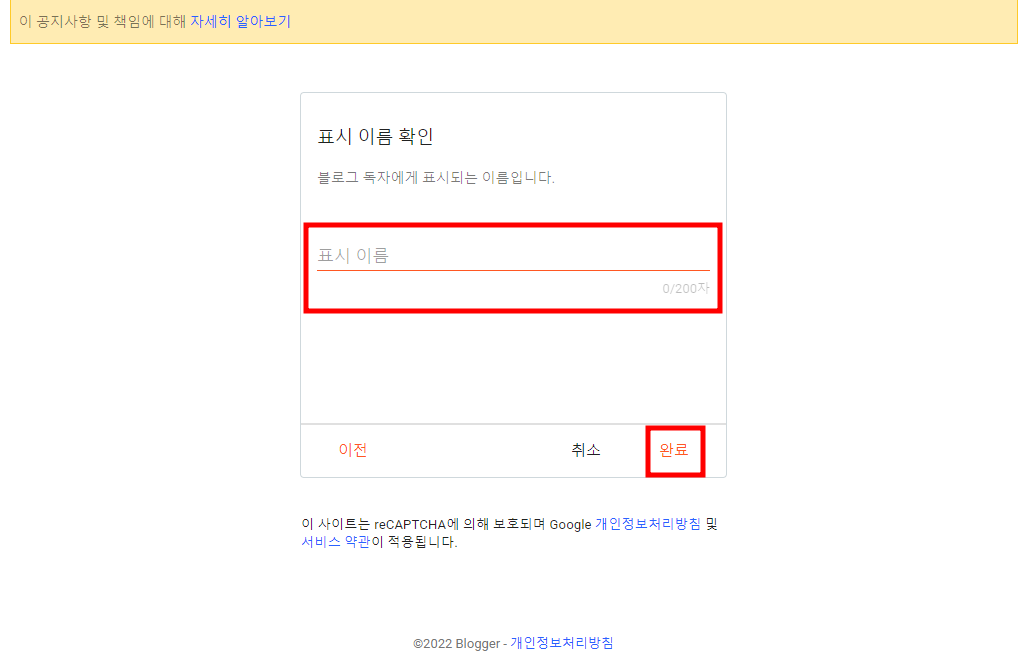 마지막으로 블로그 활동 시 표시되는 닉네임(표시 이름)을 입력해 주면 개설이 완료됩니다.