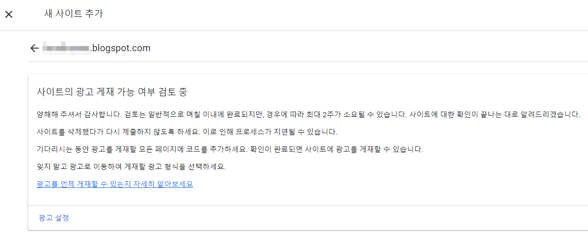 블로그를 생성하자마자 요청을 했기 때문에 승인은 안 되겠지만 '검토 요청' 버튼을 클릭해 보았습니다. 이제 블로그 생성을 완료하였으니 블로그스팟에도 열심히 글을 써봐야겠습니다.