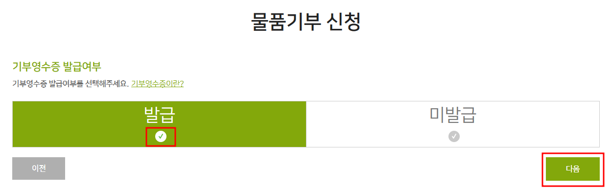 '기부영수증 발급여부'에서 '발급'을 클릭하고