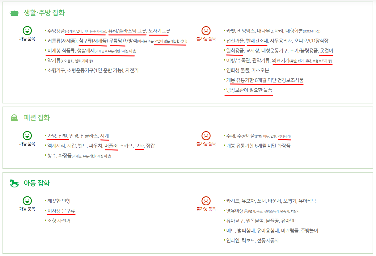 기부 가능 물품(판매가능한 물품 확인하기 클릭),