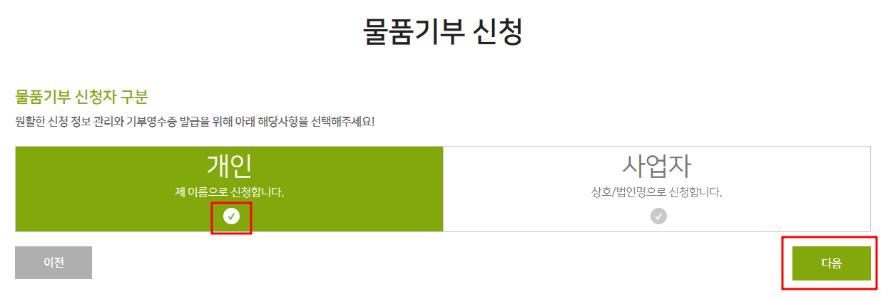 물품기부 신청자 구분에서 '개인'을 클릭하고