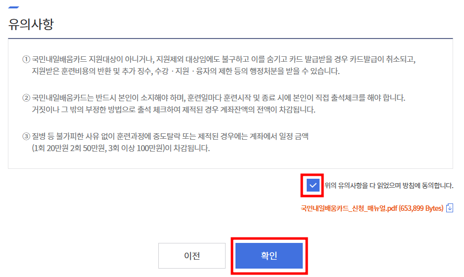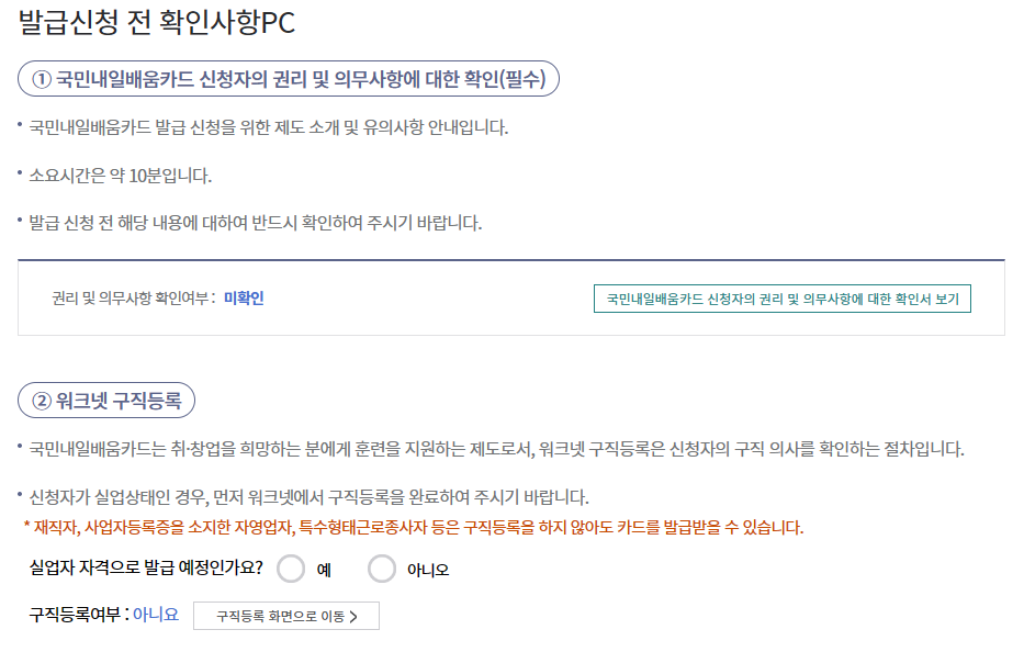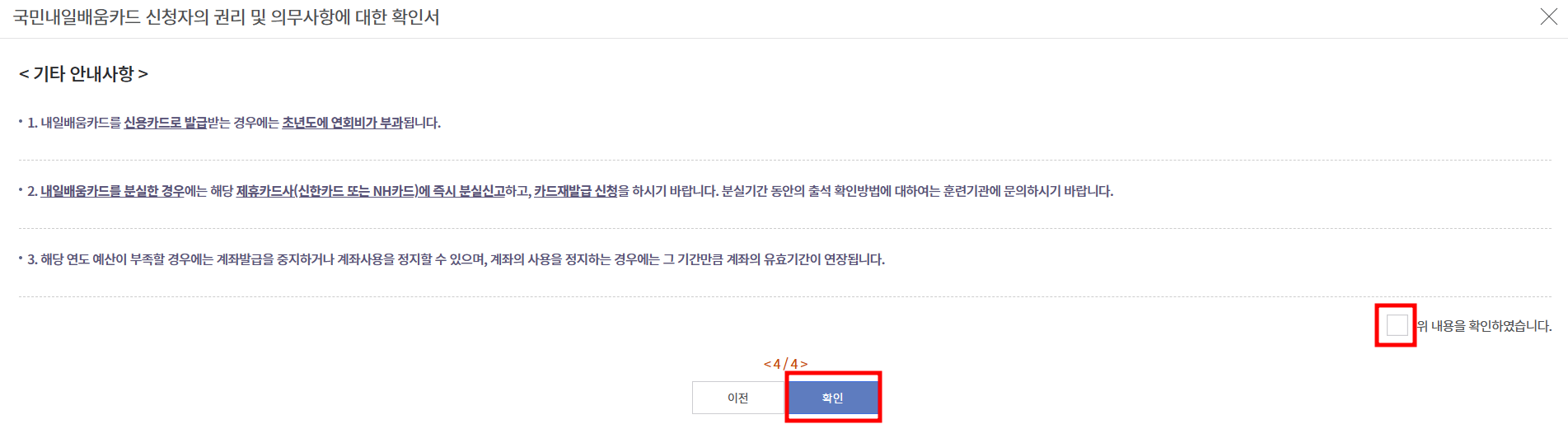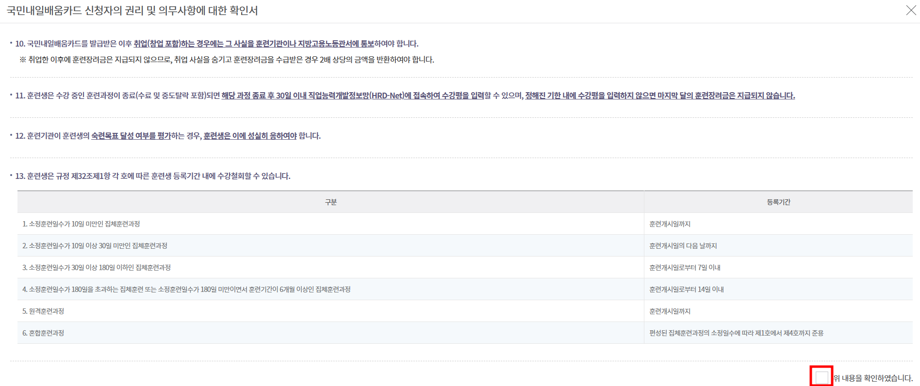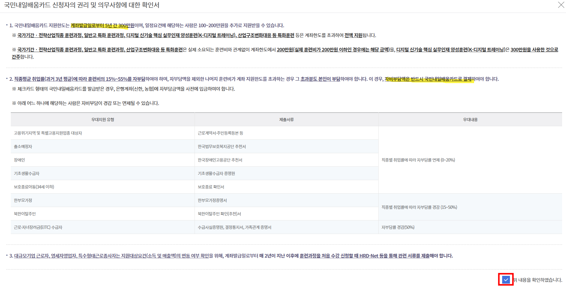 국민내일 배움 카드 지원대상 내용을 확인합니다.