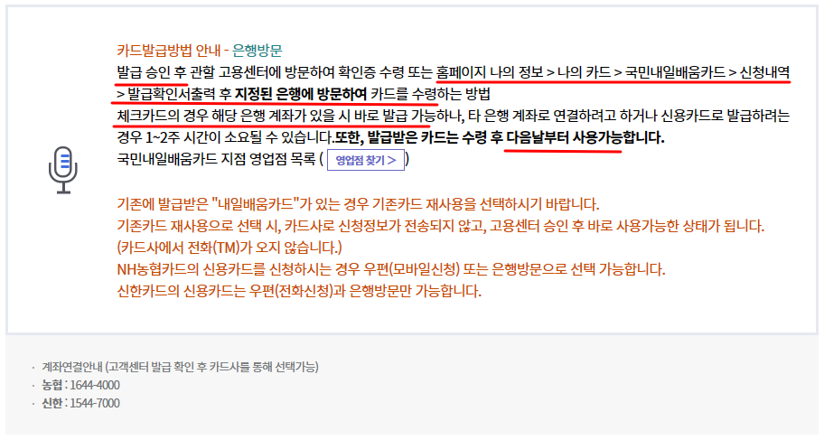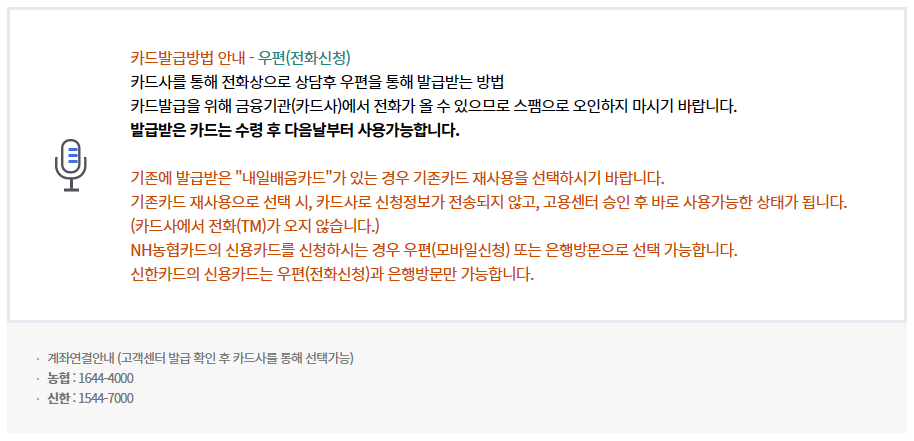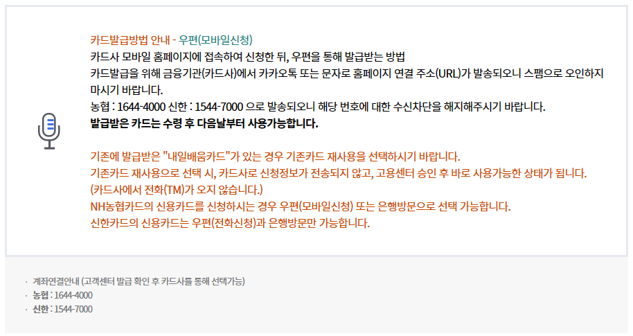 카드 발급(신청) 방법 : 우편(전화신청) / 우편(모바일신청) / 은행방문