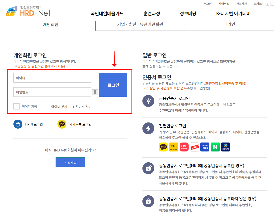 내일 배움 카드는 HRD-NET 웹사이트에서 로그인하여 신청할 수 있습니다.