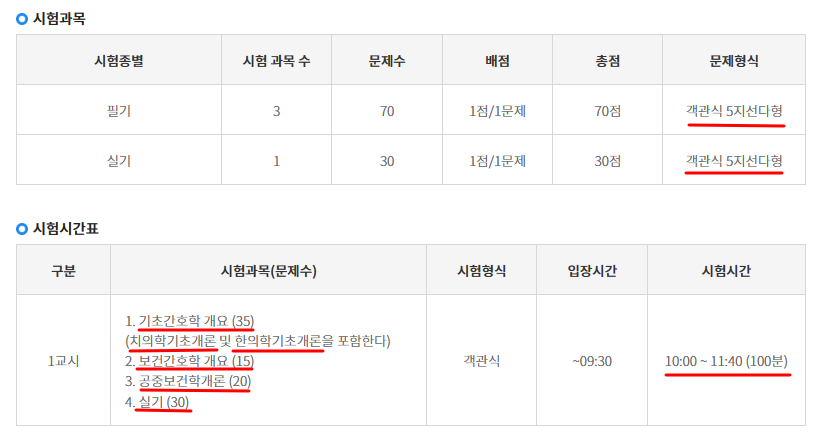 시험 과목 및 시험 시간표