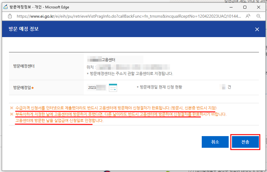 '방문 예정 정보' 팝업창이 뜨면 방문예정일을 클릭하고 우측 하단에 '전송'을 클릭 및 구직 급여 수급자격 신청서 인터넷 제출을 합니다. 혹시 모르니 '수급자격인정신청서'도 출력해서 고용센터에 방문합니다.
