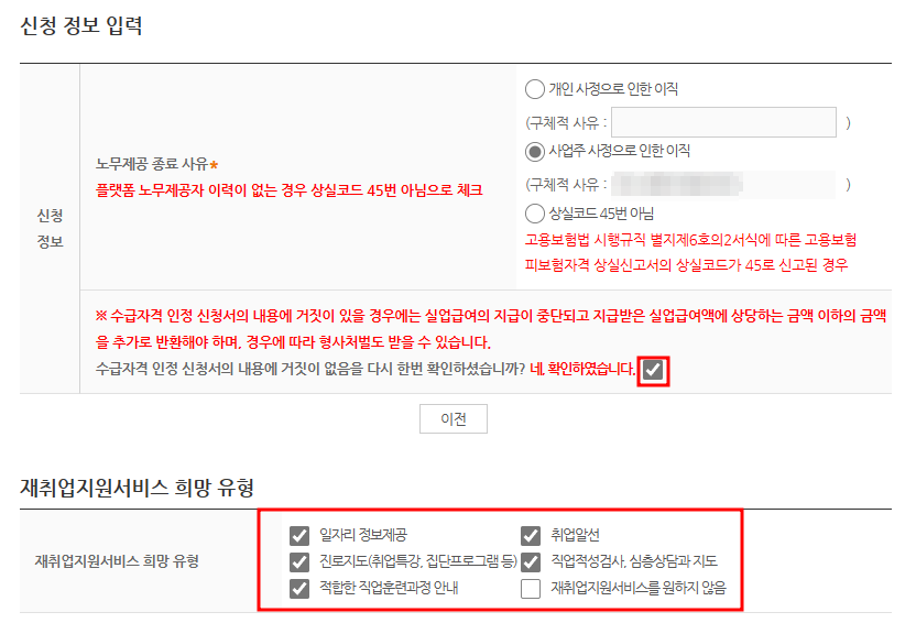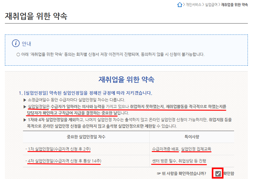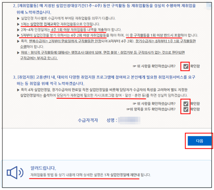 '재취업을 위한 약속' 내용을 읽고 '확인함'에 체크 후 우측 하단에 '다음'을 클릭해줍니다.