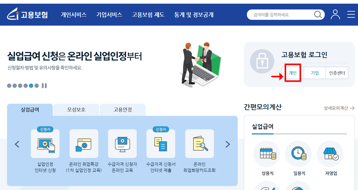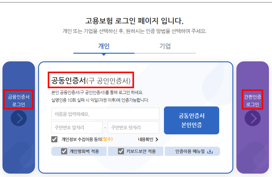 2. 고용보험 로그인에 '개인'을 클릭후 금융인증서 로그인, 공동인증서(구 공인인증서) 로그인 또는 간편 인증 로그인을 통해 로그인합니다.