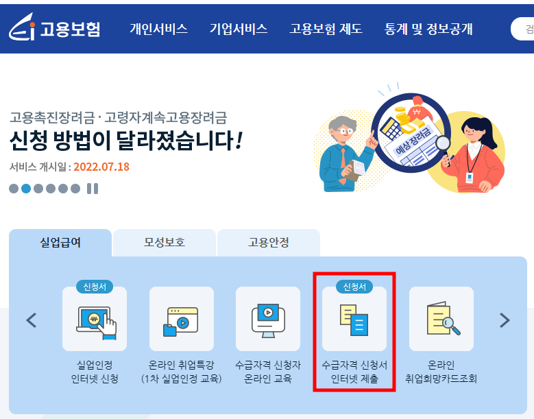 '실업급여' 탭에 있는 '수급자격 신청서 인터넷 제출' 을 클릭해 줍니다.