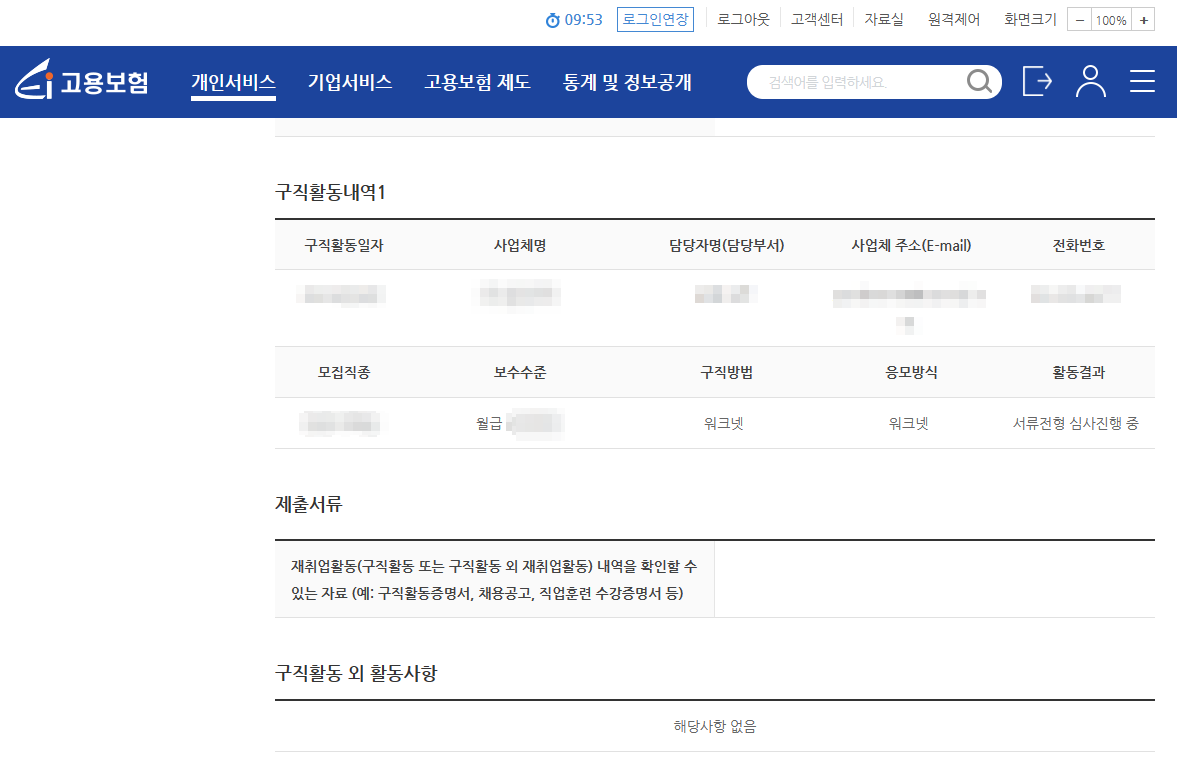 2차 실업인정 신청시, 구직활동기간 내에 워크넷에서 입사지원을 했던 건을 제출했습니다. 구직활동내역에 구직활동일자,사업체명, 담당자명, 사업체 주소, 전화번호, 모집직종, 보수수준, 구직방법, 응모방식, 활동결과를 입력해주면 되고 제출 서류는 없습니다.