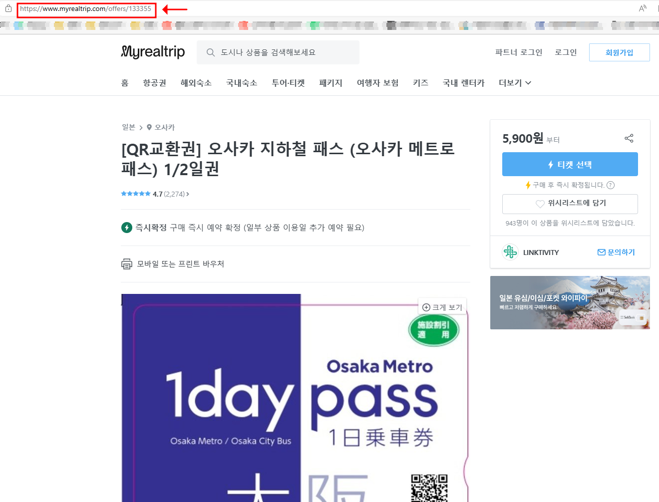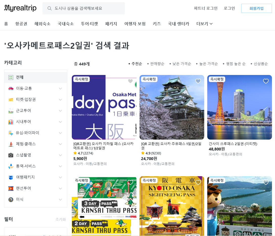 저는 '오사카 지하철 패스'를 선택하였습니다.