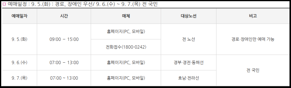 모두 명절 차표도 잘 예매하시고 여유있고 풍성한 한가위 보내시기 바랍니다:)