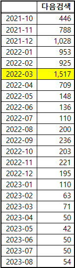 제 블로그의 경우 2022년 3월 다음검색은 1,517이었으나