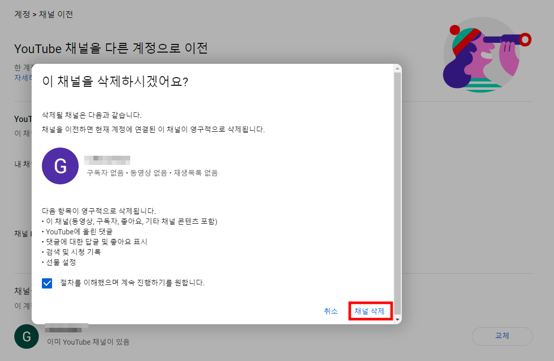 채널 삭제는 개인 채널이 아닌 방금 새로 만든 브랜드 계정 채널의 정보가 삭제된다는 의미입니다.